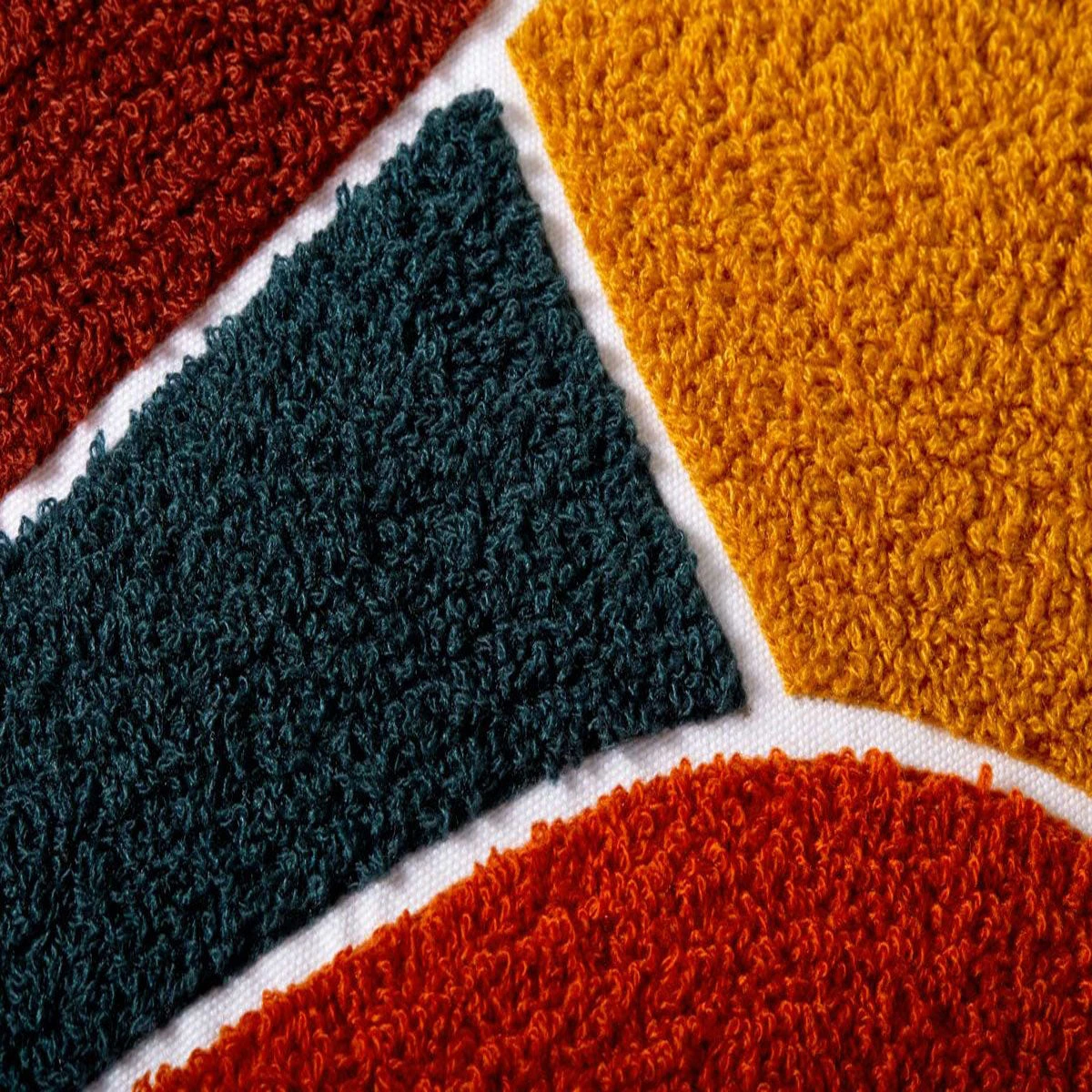 The whimsical dunes, sun, and wave shapes in a bold color palette make for one cozy piece of art! We dig the neutral gray blue-colored ground with hints of deep peacock blue, marigold, shades of red, and lavender.