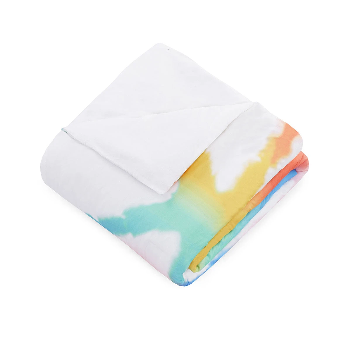 This fun printed version of the familiar hand dyeing technique would make for a lively addition to your room. Rainbow colors of blue, green, orange, yellow, pink, and lavender make up this geometric trellis of a pattern on white. Relax and stay groovy with the Tie dye Rainbow comforter. This cozy comforter is all cotton with polyester fill.