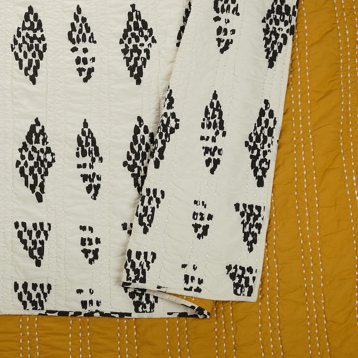 This classic color combo never goes out of style with a graphic charcoal motif on ivory. What makes this piece extra special is the kantha-style stitching in white that shows on both sides of the bedding – it’s all in the details! The reverse side of the quilt is a muted golden mustard hue with the contrast stitching in white. Fold down a corner for a small pop of gold or flip it completely – it’s totally reversible!